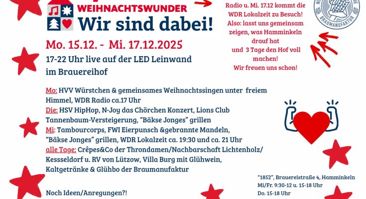Auch in diesem Jahr wird der Brauereihof der Niederrhein-Westfälischen Braumanufaktur wieder Gastgeber des WDR2 Weihnachtswunders. Vom 15.-17.12. finden jeden Abend Aktionen für den guten Zweck statt. Auch wir sind zu Gast und spielen am Mittwoch in großer Besetzung ein buntes Programm aus Weihnachtsliedern und modernen Stücken. Wir freuen uns über viele Zuhörerinnen und Zuhörer und viel Unterstützung für das WDR 2 Weihnachtswunder.